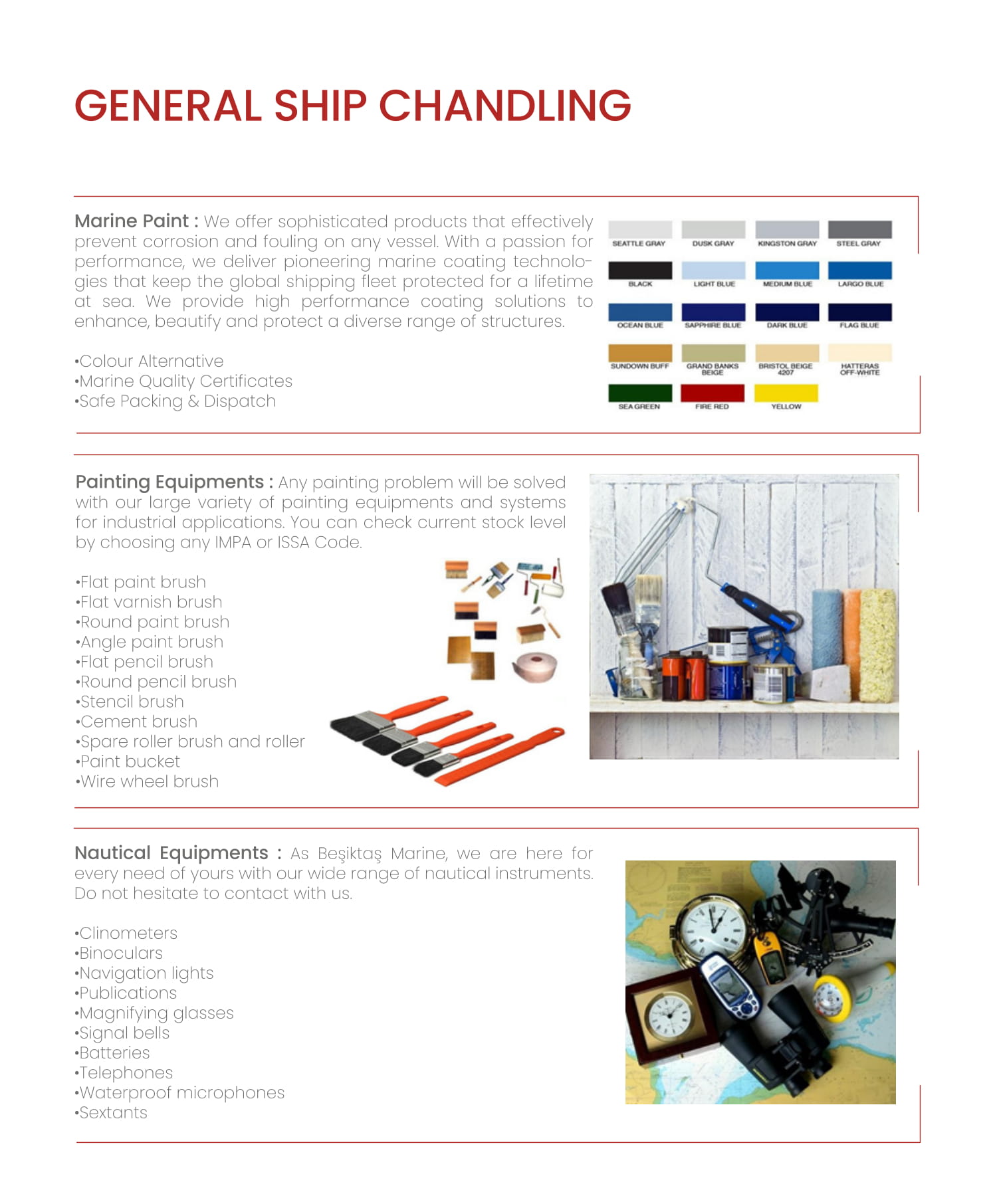 accessories for decks and engines; Charts, Nautical publications, Flags, Safety